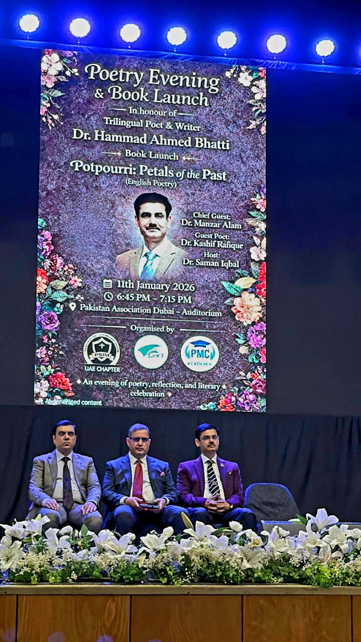 The Diabetes & Well-Being Conference, followed by a Poetry Evening and Book Launch, Organised by PSIM UAE Chapter, PAD, and PMC Academia. This event beautifully integrated medical knowledge with literary expression was successfully held on 11 January 2026 at the Pakistan Association Dubai Auditorium. The scientific programme featured insightful sessions by Dr. Zia ul Hasan, Dr. Rahila Bhatti, Dr. Seemin Shiraz, and Dr. Zulfiqar Ali, covering diabetes prevention, latest treatment advances, Ramadan care, and safe travel. The sessions were expertly moderated by Dr. Fayeza Fahim. The evening concluded with the launch of Potpourri: Petals of the Past by Dr. Hammad Ahmed Bhatti, alongside a poetry session featuring Dr. Kashif Rafique, and was gracefully hosted by Dr. Saman Iqbal whereas Dr. Manzar Alam was the Chief guest.