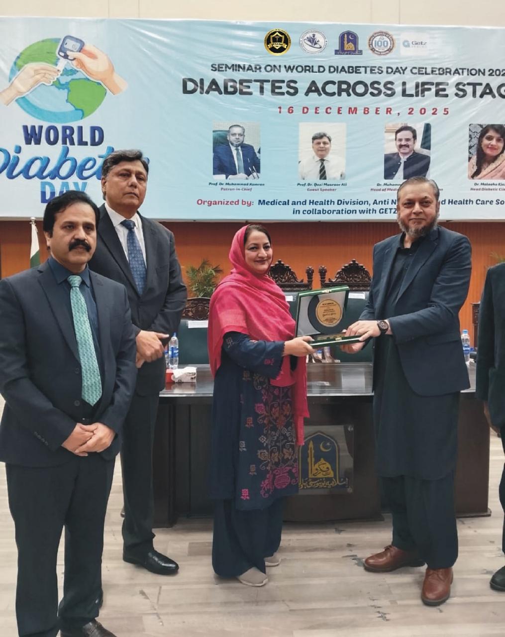 World Diabetes Day was observed at Islamia University Bahawalpur with Prof. Qazi Masroor Ali as speaker, and the Vice Chancellor IUB as Chief Guest, joined by Dr. Tanvir Shah, Madam Sadia Bilal MPA, and Madam Fouzia Qureshi Ex-MPA. The interactive session focused on prevention of Diabetes Mellitus, lifestyle modification, and evidence-based management of its complications. Faculty members, students, and distinguished guests participated actively, reinforcing the commitment to a healthier and diabetes-aware community.